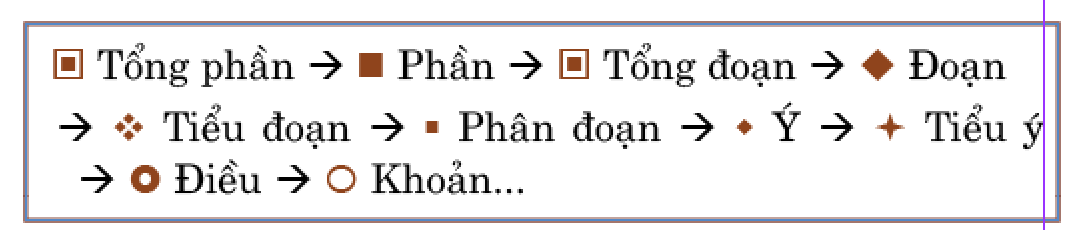 Điều tất nhiên là không phải phần nội dung nào cũng bao gồm đủ các cấp độ phân chia như trên, nhưng đó là nói ở những phần được phân chia chi tiết nhất. Cũng có nhiều nơi mức độ phân chia đơn giản, ít chi tiết hơn và chỉ có các phần được chia thành đoạn, các đoạn được chia thành tiểu đoạn v.v.
